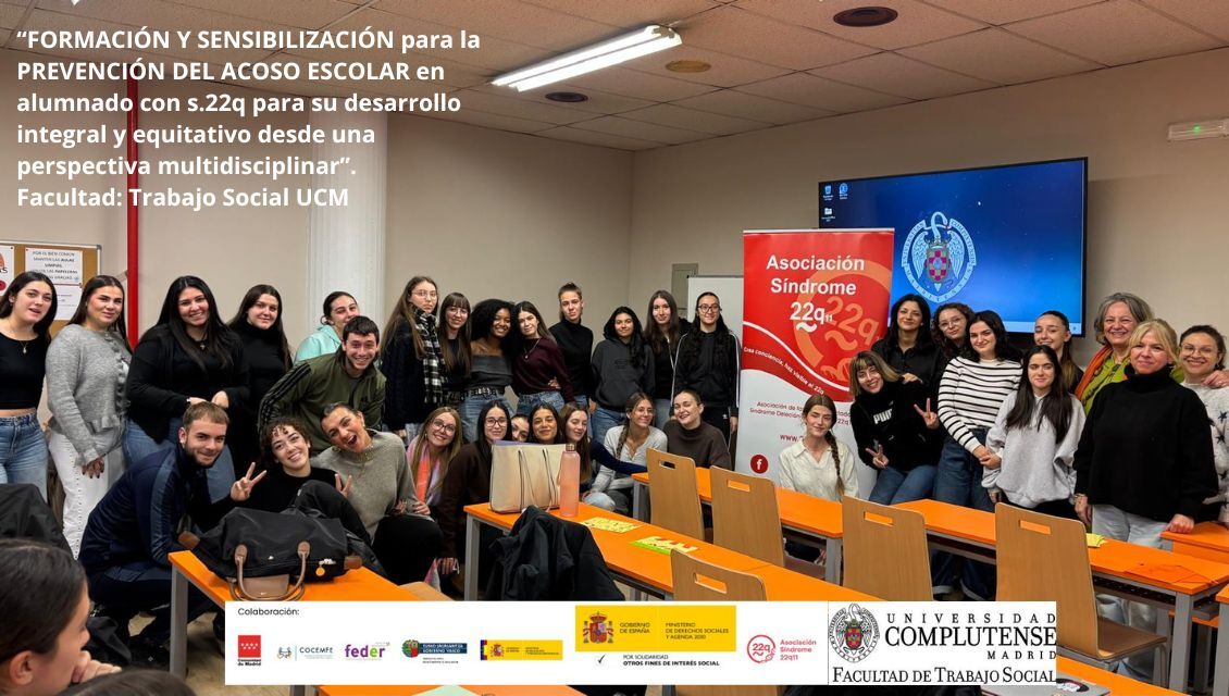 En noviembre, se impartió una sesión en la Facultad de Trabajo Social de la UCM dirigida a estudiantes y profesionales del ámbito social y educativo, en el marco del proyecto “FORMACIÓN Y SENSIBILIZACIÓN para la PREVENCIÓN DEL ACOSO ESCOLAR en alumnado con s.22q para su desarrollo integral y equitativo desde una perspectiva multidisciplinar”. La actividad se centró en la prevención del acoso escolar en niños y adolescentes con síndrome 22q11, ofreciendo herramientas prácticas y recomendaciones para un abordaje multidisciplinar. La charla promovió la sensibilización sobre la importancia de la igualdad de oportunidades y la participación de la comunidad educativa y social en la protección de los menores.